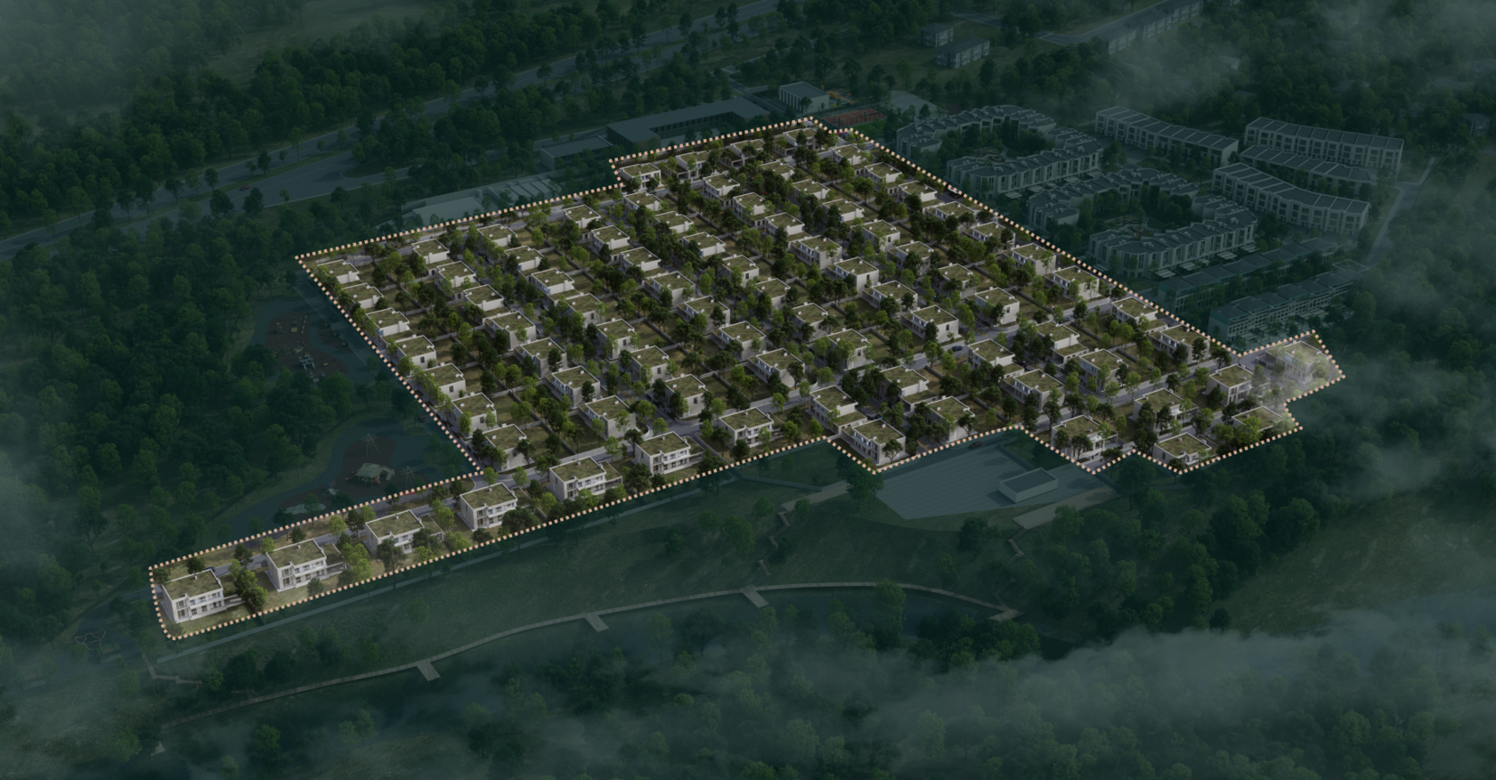 Пространство поселка организовано по принципу “город в миниатюре” - с собственными социальными функциями, сервисами и зонами активности, не нарушающими приватность жилых участков.